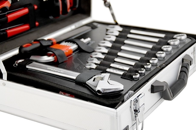 Ve vrchní části kufru se zabudovaným organizérem naleznete šroubováky různých rozměrů a elektrikářskou zkoušečku. Také se zde nacházejí nejběžněji používané kleště, včetně kombinovaných, štípacích a střihacích. Kufr s ergonomicky tvarovanou rukojetí tvoří hliníková konstrukce s kovovými rohy a sponami pro bezpečné uzavírání.