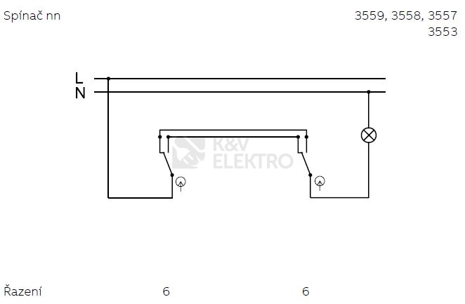 Vypínač č. 6 – obvykle nazýván „schodišťový“ – je jednopólový přepínač bez polohy vypnuto. Má dva vývody a jeden společný přívod, jako vypínač č. 6 má jednu klapku. Instaluje se v místech, v nichž si přejete ovládat jedno svítidlo ze dvou míst a to nejčastěji na začátku a na konci schodiště nebo chodby.