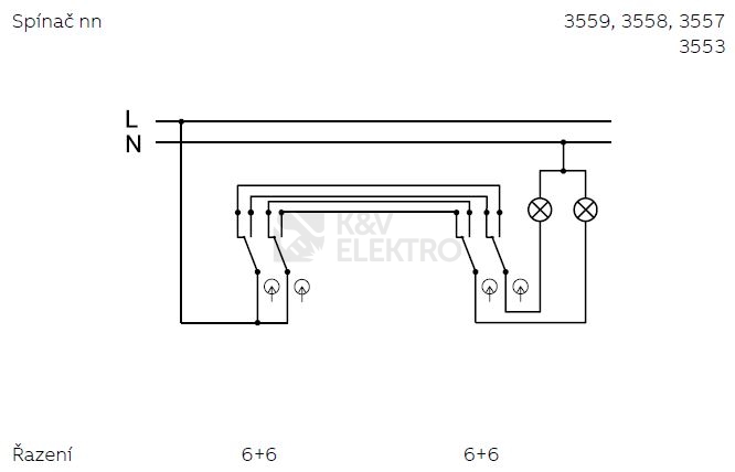 Dvojitý schodišťový vypínač č. 6+6 3557G-A52340 S1 je dimenzované na proud 10 A a napětí 250 V. Spínač 6+6 má šroubové svorky a stupeň krytí IP20.