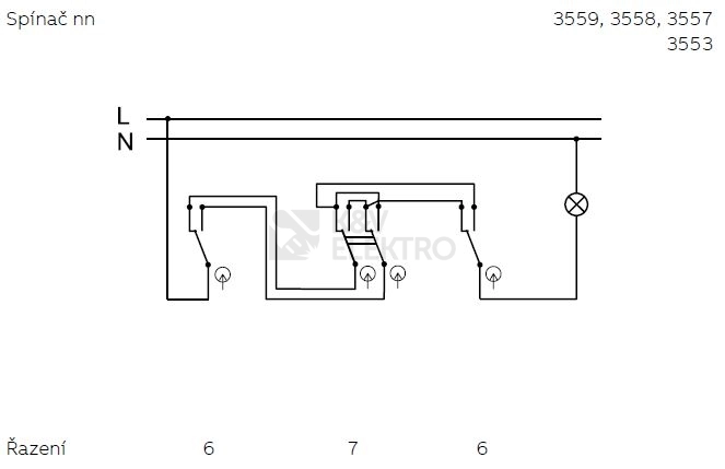 Křížový vypínač č. 7 3557G-A07940 B1 v krytí IP44 je dimenzované na proud 10 A a napětí 250 V. Spínač č. 7 má šroubové svorky pro vodiče 1-2,5 mm², upevnění může probíhat pomocí šroubků nebo drápků.