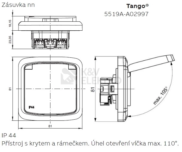 Aby byl dodržen stupeň krytí IP44, je nutné zásuvku ABB Tango 2CHA196997A6507 instalovat maximálně do trojrámečku.
