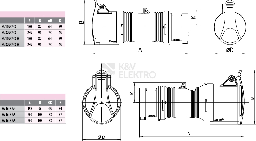 Adaptér, EA-1653/43, Stupeň krytí IP IP44, Počet pólů 5/4, Jmenovitý proud (A) 16, Un (V) 400, Typ (zásuvka / zástrčka) Adapters 5->4p, Funkce Příslušenství