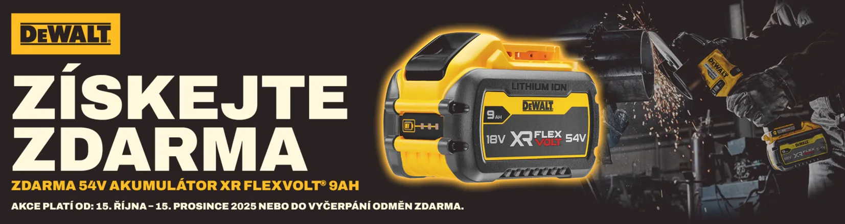 Pořiď si vybrané nářadí DEWALT z inovativní řady 54V XR FLEXVOLT a získej navíc baterii zdarma pro ještě větší výkon a delší výdrž při práci.