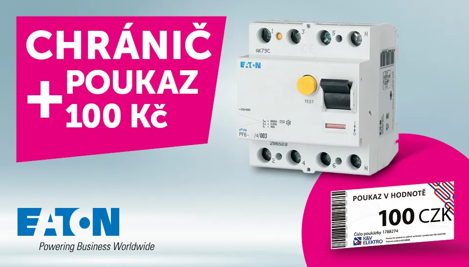Kup si během února proudový chránič EATON PF6-25/4/003-A* a ke každému od nás dostaneš 100 Kč poukázku do K&V ELEKTRO na příští nákup!