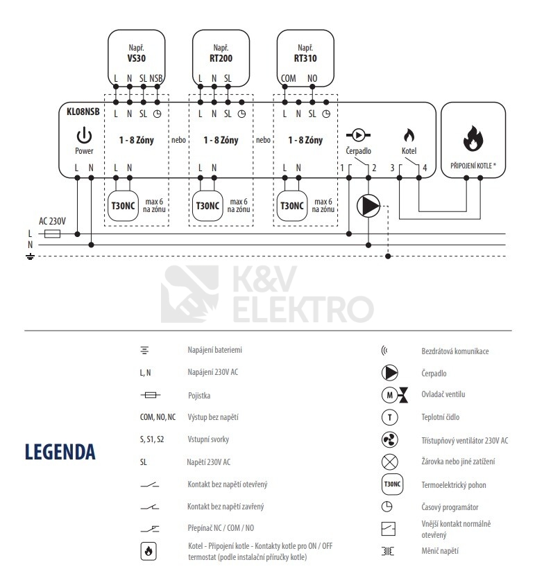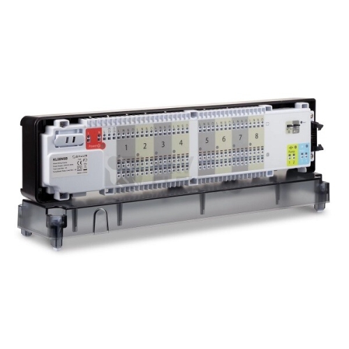 entrální svorkovnice SALUS KL08NSB je hlavní řídicí jednotkou pro systém podlahového vytápění. Umožňuje rychlé a přehledné připojení pomocí metody PLUG-IN a je vybavena integrovaným modulem pro ovládání čerpadla a kotle. Svorkovnice je kompatibilní s pohony typu NC (bez napětí uzavřené) i NO (bez napětí otevřené). ZÁKLADNÍ VLASTNOSTI: Centrální jednotka pro regulaci podlahového vytápění Beznapěťový výstup připojení čerpadla Beznapěťový výstup připojení kotle Možnost připojení termoelektrických pohonů typu NO nebo NC Snadné připojení vodičů metodou PLUG-IN Indikace stavu pomocí LED diod Možnost připojení externích hodin Funkce NSB – možnost automatického snížení požadované teploty na denních termostatech SALUS VS35 prostřednictvím programovatelného termostatu SALUS VS30 (nebo externích hodin) Možnost rozdělení 8 termostatů na 2 skupiny po 4 termostatech Přepěťová pojistka Může být namontována na DIN lištu 35 mm