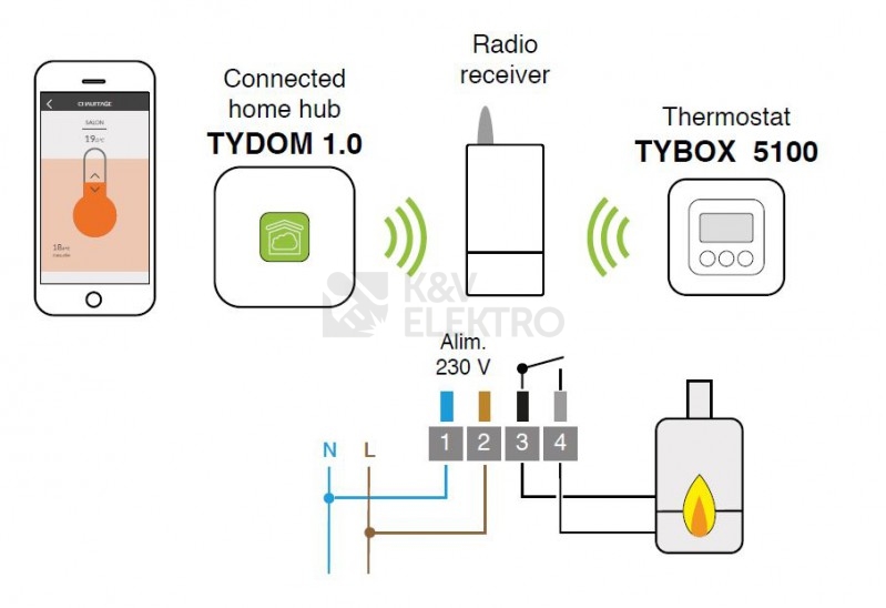 - Sestava bezdrátového/přenosného termostatu, přijímače ke kotli a internetové brány TYDOM 1.0
