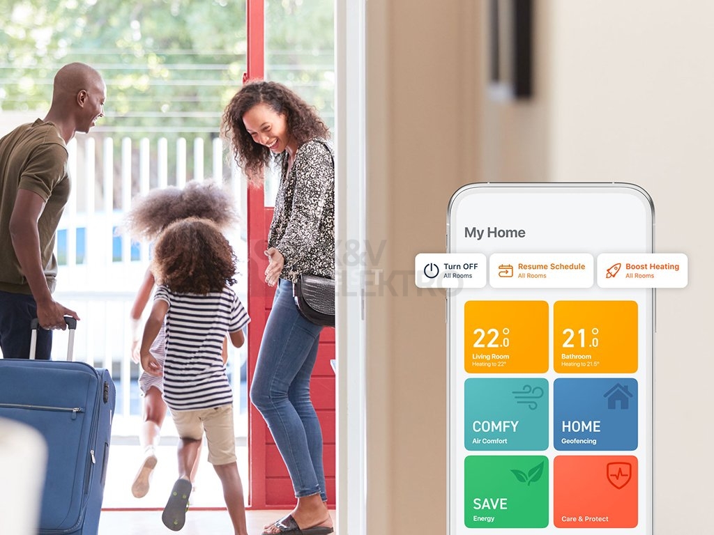 Pomocí funkce sledování polohy vašeho mobilního telefonu (Geofencing) vám tado° připomene, abyste ztlumili topení, když odchází poslední osoba z domova, a zapnuli ho včas, než přijde první. Geofencing spolu s vyspělým algoritmem řízení teploty dokáže ušetřit až 31 % nákladů na vytápění.