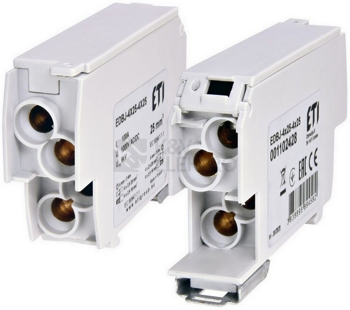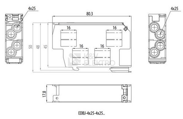 Distribuční blok, EDBJ-4x25-4x25/PE, Materiál svorky MO-58, Materiál těla PC/ABS, Jmenovité izolační napětí (V) 1000, Pracovní teplota (°C) -30°C - +80°C, Jmenovitý průřez (mm2) 4x2,5-25mm2-4x2,5-25mm2, Hlubka (mm) 50, Šířka (mm) 17,8, Výška (mm) 80,3... číst více