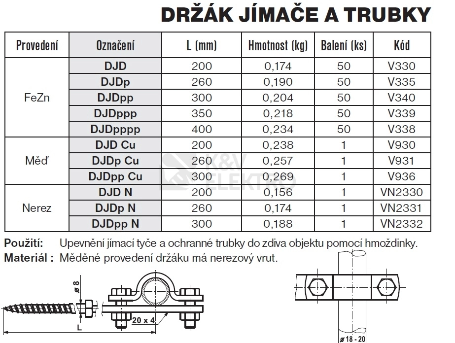 Držák jímací tyče DJDpp TREMIS V340 je určen pro upevnění jímací tyče do dřeva. Je vyroben z kvalitního materiálu, který zajišťuje vysokou pevnost a odolnost. Držák jímací tyče je vhodný pro tyče o průměru 22 mm. Montáž je velmi jednoduchá a rychlá. Držák jímací tyče se upevňuje pomocí šroubu, který je součástí balení. Tento držák jímací tyče je vhodný pro použití v elektroinstalacích, kde je potřeba upevnit jímací tyč do dřeva. V naší nabídce najdete také další druhy držáků jímacích tyčí a další elektroinstalační materiál.Shrnutí a doporučení produktu
