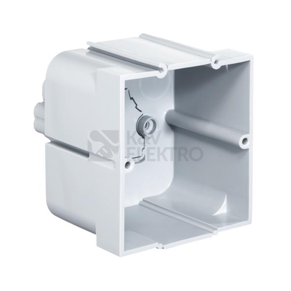 Krabice je zhotovena z odolného plastu, takže zvládá běžné požadavky na mechanickou stabilitu v izolačních vrstvách. Přístroje se v ní fixují pomocí šroubování, což podporuje přesné usazení i po dotažení rámečku. Pro vedení instalace je připraven průchod zezadu, který zjednoduší přivedení kabeláže ze stěny nebo dutiny.