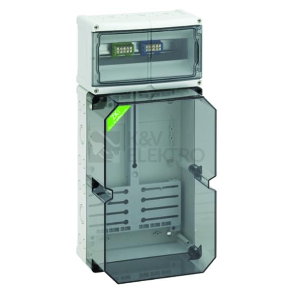 Skříň elektroměru-průmyslová kvalita -, s transparentním víkem, sériově plombovatelné, s namontovaným elektroměrovým křížem a připevňovacími šrouby elektroměru, sériově plombovatelný spotřebitelský prostor nahoře, s 35mm DIN lištou a dvojitou svorkou PE/N, s hrdlem s dvojitou membránou, Zaslepovací zátka a izolační krytka, pro třífázové elektroměry, rozměry: 250 x 520 x 193mm