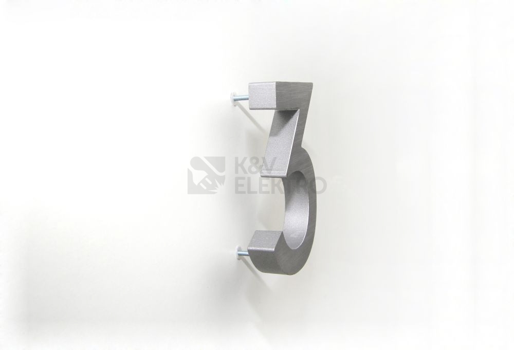 Hliníkové číslo v 3D provedení s broušeným povrchem.Výška: 100 mm, .Povrch: stříbrná matnáVarianty způsobu montáže:Lepení - pomocí oboustranné lepicí pásky 3M. Vhodné pro středně hrubé a hladké povrchy, např. fasády, vnitřní stěny, dveře, … . Výhodou tohoto postupu je snadná a přesná montáž.Vrtání - našroubováním svorníků do čísel, vyvrtáním 2 otvorů do zdiva a vložením hmoždinek. Výhodou je zcela pevná montáž a možnost předsazení čísel, které tak vytváří efektní dojem, nevýhodu pak obtížnější montáž a dosažení vodorovné osy.Přibití - našroubováním hřebu se závitem do čísla a pomocí gumové nebo dřevěné paličky přibijte na příslušnou plochu. Balení vč. oboustranné lepicí 3M pásky, 2 ks hmoždinek, 2 ks svorníků s matkou a 2 ks hřebů