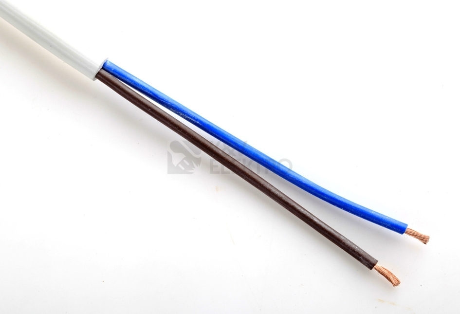 Kabel H05VV-F 2x1 (CYSY 2Dx1,0) je tvořen ze dvou žil. Jednotlivý vodič se skládá z měděného lanovaného jádra, PVC izolace a bílého pláště.