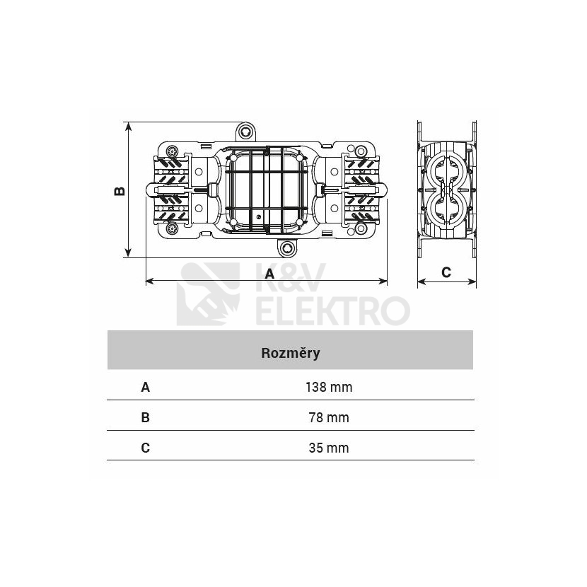 Spojka gelová PAGURO 5660/4/2 IP68, se svorkou 3x6mm2. Vnější průměr kabelu (min. - max.) 7,5 - 16 mm. Odbočné spojení, 450V/25A, rozměry: 138 x 78 x 35 mm.Profesionální řešení elektrického spoje s vysokou odolností vůči podzemní vodě, vzlínající vlhkosti... číst více