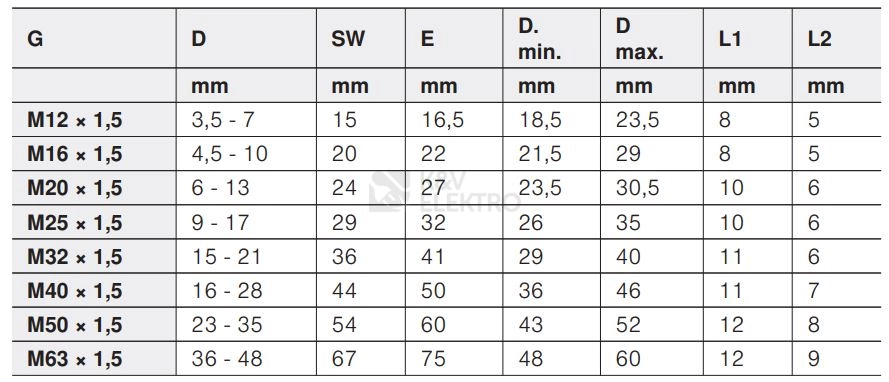 Instalace je rychlá a přesná: do panelu s připraveným průměrem otvoru 12 mm se vývodka našroubuje pomocí metrického závitu M12 se stoupáním 1,5 mm a délkou závitu 8 mm. Při utahování usnadní práci velikost klíče 15 mm a dobře uchopitelný šestihran 16,5 mm od rohu k rohu. Těleso z plastu s typem materiálu polyamid nabízí stabilní mechanické vlastnosti a bezhalogenové provedení podporuje bezpečnost v budovách.