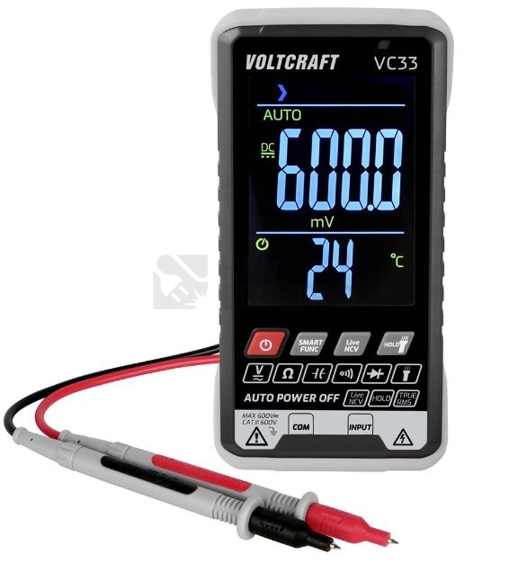 Přístroj VOLTCRAFT SmartDMM VC33 je použitelný v rozsahu měření Cat III 600 v a nabízí řadu funkcí, od měření AC/DC napětí přes měření odporu a kapacity až po test diod. Kromě toho je možné bezdotykové rozpoznání napětí (NCV).Praktické funkce. Dobře čitelný negativní LCD displej zobrazuje 5999 digitů a má funkci Data Hold pro zobrazení naměřených hodnot na těžko přístupných místech. Varovný symbol informuje, když se baterie nechá opustí, a VOLTCRAFT SmartDMM VC33 se v zájmu úspory energie automaticky vypne. Obzvláště praktické funkce: Pro měření na špatně osvětlených místech lze digitální multimetr zprovoznit i jako kapesní svítilnu. Ihned k použití. Přístroj VOLTCRAFT SmartDMM VC33 je dodáván s bateriemi, 1 párem měřicích kabelů, uživatelskou příručkou.