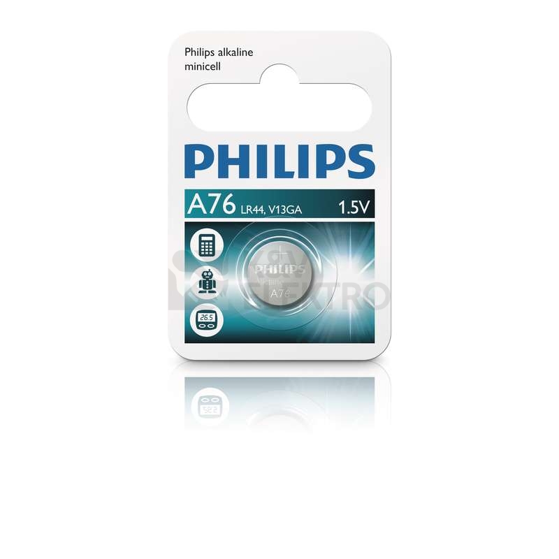 Knoflíková baterie Philips speciální LR44, označovaná též jako A76 nebo V13GA, má napětí 1,5 V a doba skladovatelnosti dosahuje 3 let. Má alkalické chemické složení.