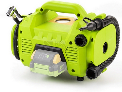 Akumulátorový kompresor Fieldmann FDAK 70205-0 s maximálním výstupním tlakem 10,3 bar a průtokem vzduchu 235 l/min. Vybaven je ergonomickým držadlem pro snadné přenášení. Nabíječka a baterie nejsou součástí balení.
