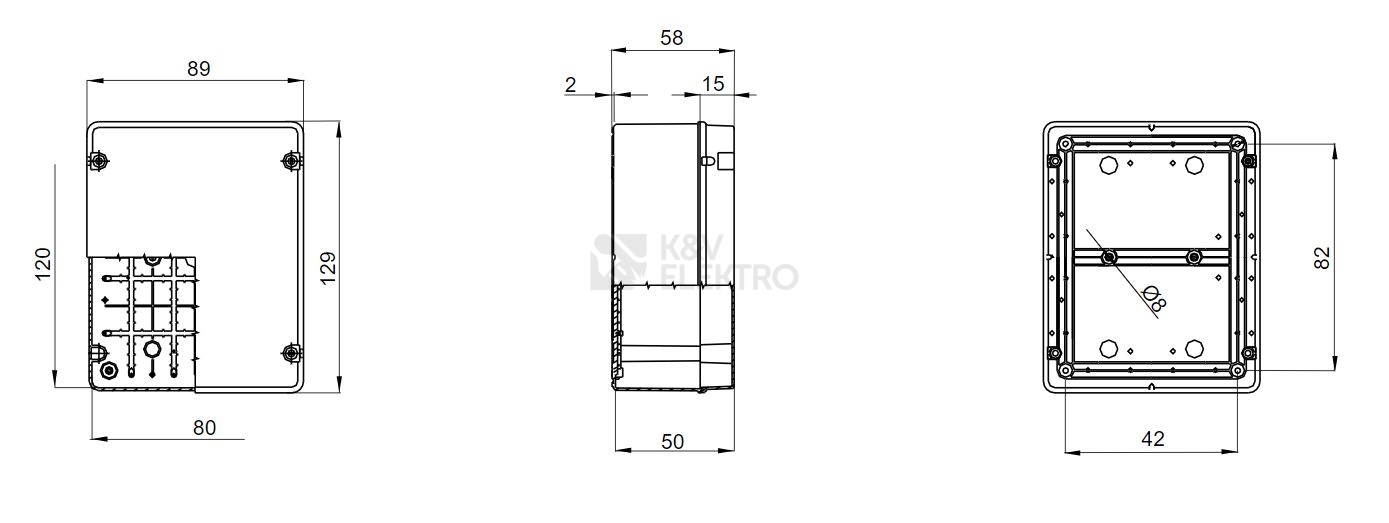 Vnitřní rozměry rozbočovací krabice jsou (š x d x h): 120x80x50 mm.