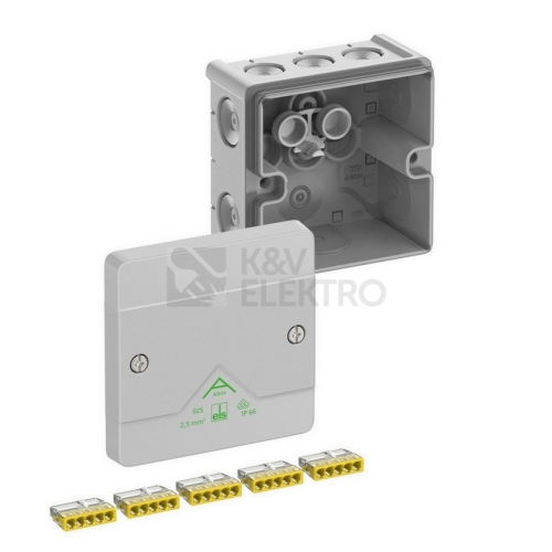 Rozbočovací krabice, se stupněm krytí IP66, Jmenovitý průřez 2,5 mm², Certifikováno VDE (DIN EN 60670-1/-22 (VDE 0606-1/-22)), DLG (odolnost vůči čpavku), Samotěsnicí měkká přívodní membrána, M16/M20, Rozsah těsnění 4 - 16 mm, (1 Zpětné, 8 bočně), Vnitřní místa pro připevnění, pro standardní instalace ve vnitřním prostoru a chráněném venkovním prostředí, šedá, Ui=450 V AC, In=24 Ampéry, s 5 bezšroubovými 5-vodičovými svorkovnicemi Wago 2273-205, max. jmenovitý průřez podle DIN EN 60998: 2,5 mm², svorkovatelné průřezy na pól: 5 x 0,5 - 2,5 mm² pevné Cu/Al (Dodržujte montážní návod!) Rozměry: 87 x 87 x 52 mm