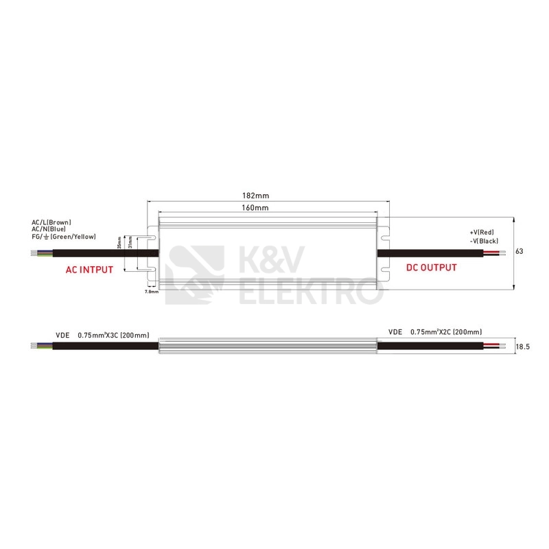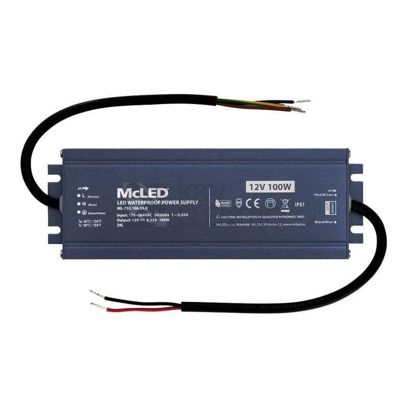 Zdroj konstantního napětí, výkon 100W, krytí IP67, výstup: 12VDC, max. 8,33A. Vstup: 175-264VAC, 50-60Hz, materiál krytu: hliník. Rozměry: 160x63x18,5mm, hmotnost: 366g. Zdroj SELV. Při výběru zdroje počítejte s výkonovou rezervou min. 20%.