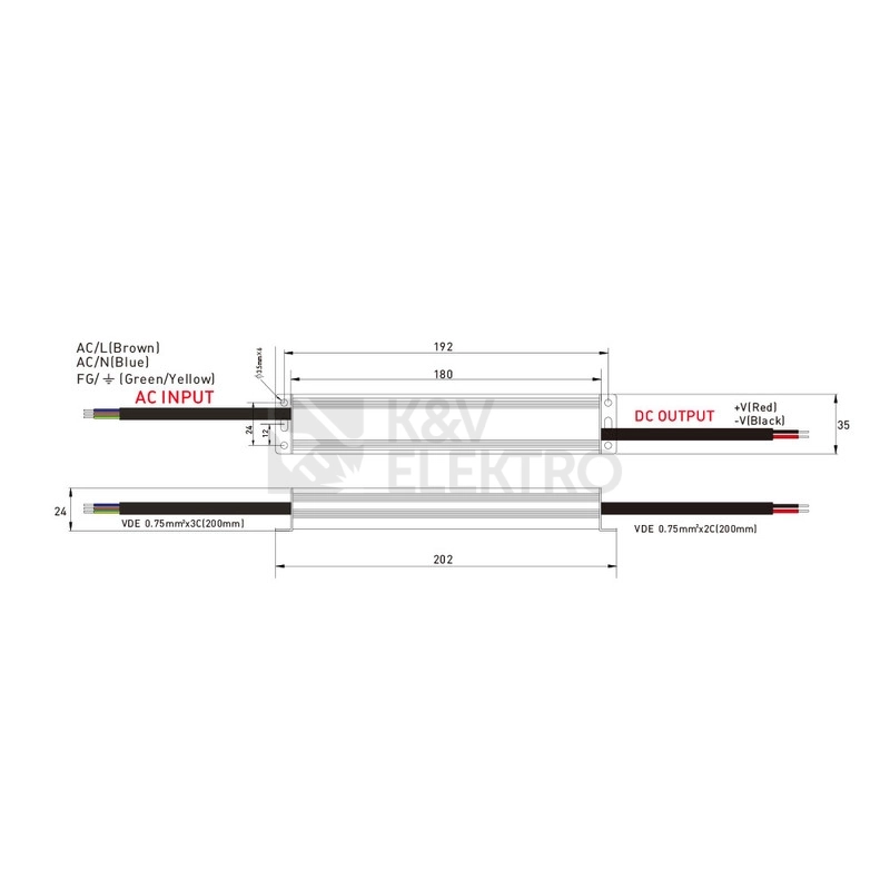 Zdroj konstantního napětí, výkon 60W, krytí IP67, výstup: 24VDC, max. 2,5A. Vstup: 175-264VAC, 50-60Hz, materiál krytu: hliník. Rozměry: 180x35x24mm, hmotnost: 268g. Zdroj SELV. Při výběru zdroje počítejte s výkonovou rezervou min. 20%.