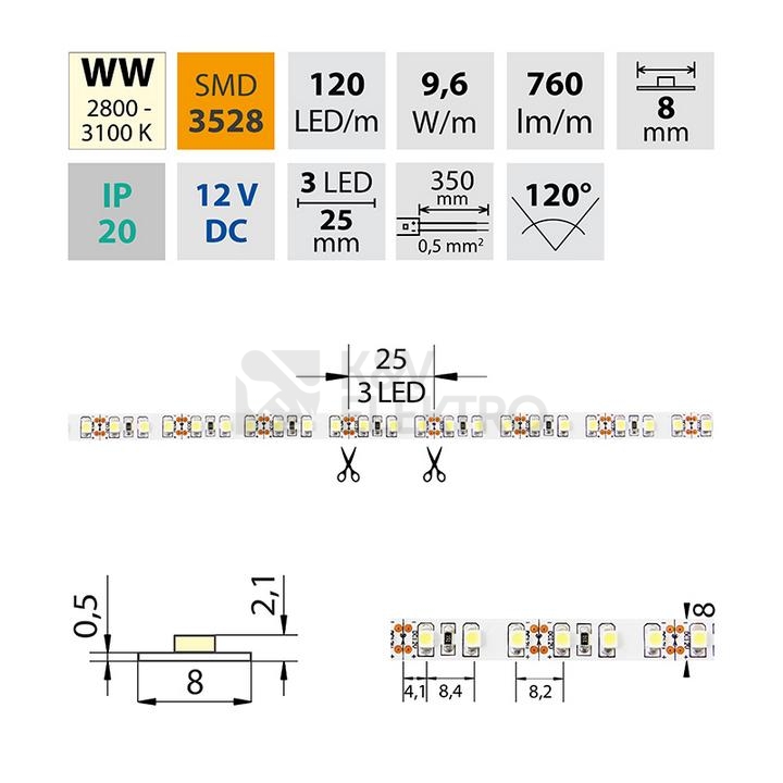 LED pásek McLED 12V teplá bílá š=8mm IP20 9,6W/m 120LED/m SMD3528 ML-121.231.60.2