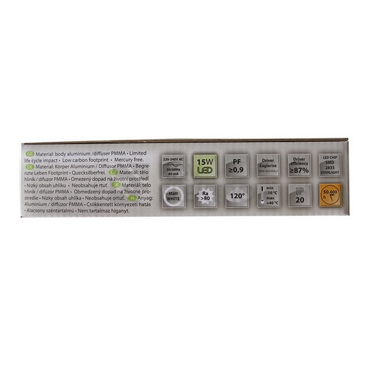 Podhledové LED světlo McLED Toro S15 ve tvaru čtverce o hraně 158 mm má výkon 9 W (ekvivalent 1X26 W CFL), vyzařovací úhel 120°, světelný tok 1050 lm a teplotu chromatičnosti 2700 K. Životnost dosahuje 50.000 hodin a stupeň krytí IP20.