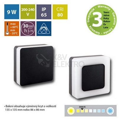 LED nástěnné a fasádní svítidlo Draco S, součástí balení dva druhy magnetických krytů, černá barva, 9W, 230V, IP65, teplá bílá (3000K), světelný tok až 562lm, vyzařovací úhel 52/127°, CRI80, životnost až 30.000h, rozměry 135 x 135 x 48, materiál hliník/plast, nestmívatelné.