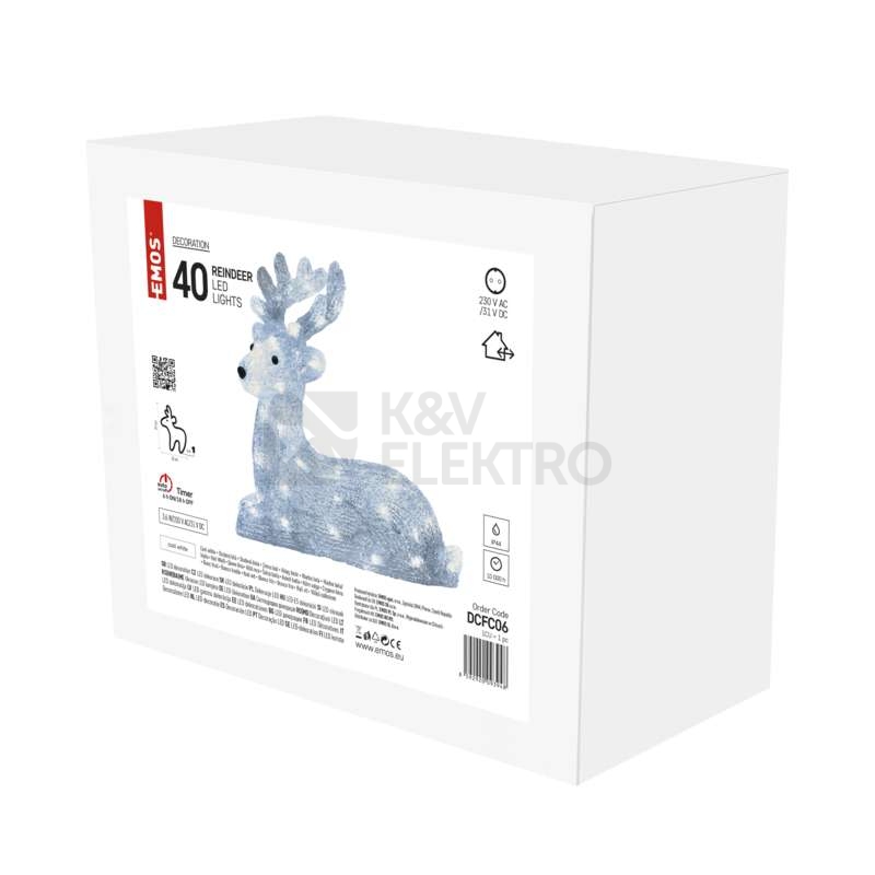 Postavička LED vánočního jelínka EMOS DCFC06 ZY2275 pracuje na napětí 230 V o příkonu 2,4 W. Disponuje 40 LED diodami ve studené bílé barvě. Včetně časovače. Krytí IP44.