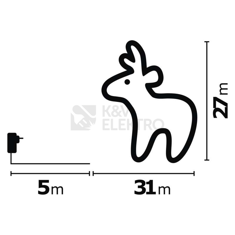 Vánoční jelen Emos je 31 cm vysoký a 27 cm široký. Díky LED technologii vyzařující studené bílé světlo s příkonem 2,4 W se můžete spolehnout na dlouhou životnost této vánoční dekorace. Stupeň krytí je IP40.