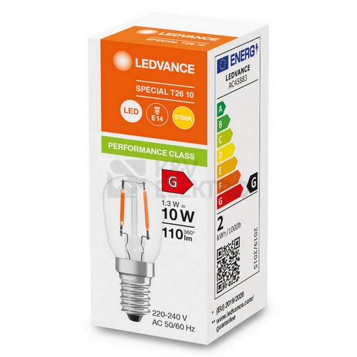 LED žárovka do lednice E14 LEDVANCE PARATHOM T26 Filament 2,2W (12W) teplá bílá (2700K) se používá pro osvětlení lednice. S výkonem pouhých 2,2W nahradí standardní 12W žárovku. Teplá bílá barva světla o teplotě chromatičnosti 2700K vytváří příjemné světlo a zároveň nezvyšuje teplotu v lednici. Žárovka má patici E14 a nabízí průměrnou životnost 15 000 hodin.