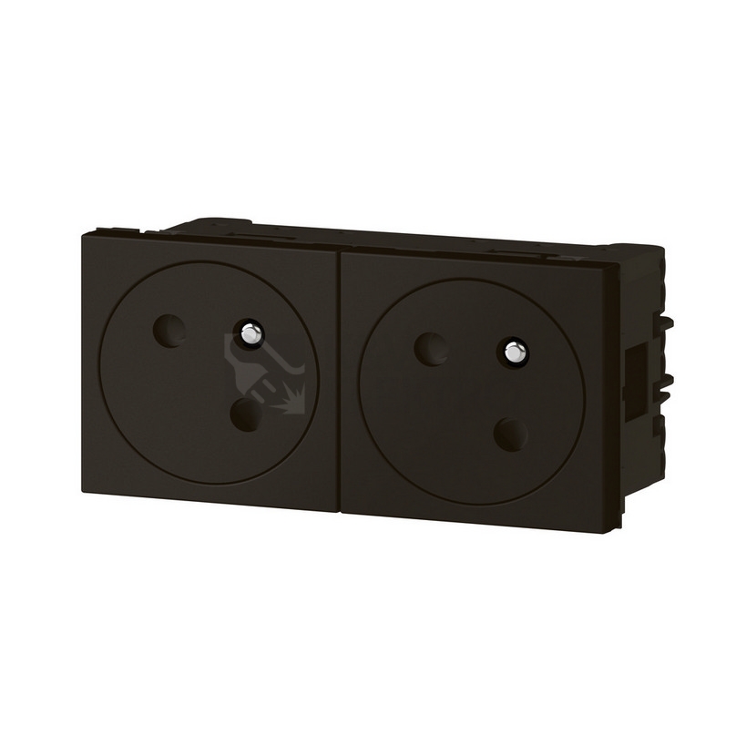 Tento prvek je určen pro modulové sestavy v řadě Mosaic a svým provedením poskytuje dvě napájecí pozice v jednom celku. Díky počtu jednotek 2 a modulové šířce odpovídající 4 modulům se snadno zařadí do rozvoden či instalačních rámečků, kde je potřeba kompaktní řešení více zásuvek. Vizuálně působí střídmě, protože přichází bez potisku a v plně černém provedení.