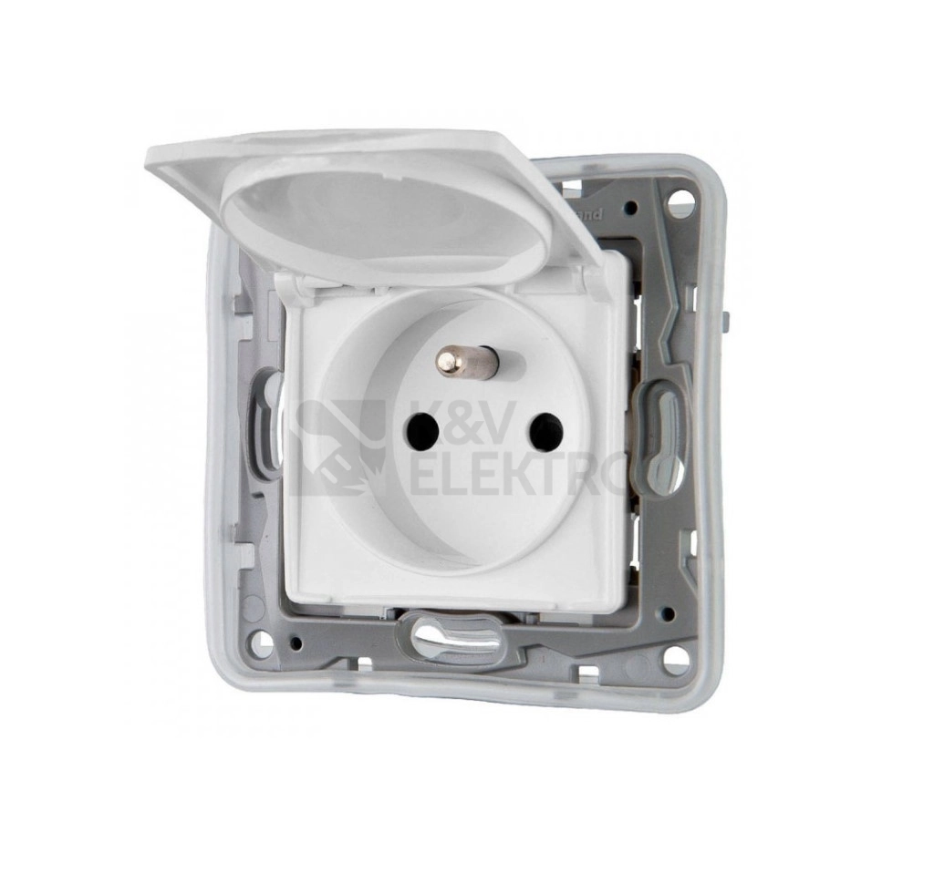 Bílá zásuvka IP44 Legrand Niloe s krytem má jmenovitý proud 16 A a napětí 250 V. Disponuje šroubovou svorkou, instalace probíhá pomocí šroubků nebo příchytek.