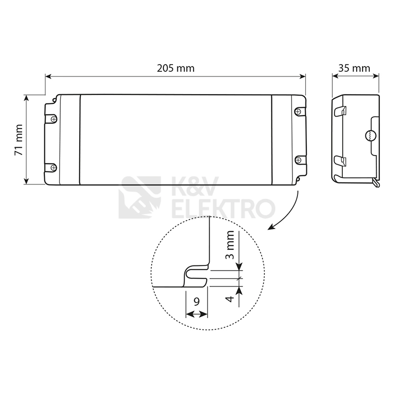 Trafo pro LED pásky 24 V DC s výkonem 150 W a proudem 6250 mA je vyrobené z plastu a má rozměry 205 mm x 71 mm x 35 mm. Napájecí zdroj s označením SELV (bezpečné napětí) má stupeň krytí IP20 a disponuje vstupní a výstupní svorkovnicí. Trafo má certifikáty CE, RoHS, MM a F.