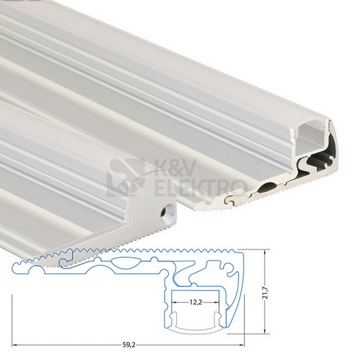 Nášlapný stříbrný hliníkový profil pro LED pásky, rozměry průřezu cca 59x22 mm. Součástí je matný difuzor, který lze do profilu nacvaknout. Tento profil je určen pro krytí a chlazení LED pásků do šíře 12 mm a max 28,8W/m. Vhodný pro montáž na schodnice jako protiskluzové provedení. Upevnění k podkladu lze provést pomocí vrutů, lepidel, přičemž jsou upevňovací otvory překryty vrchním profilem. K profilu lze zakoupit koncovky.