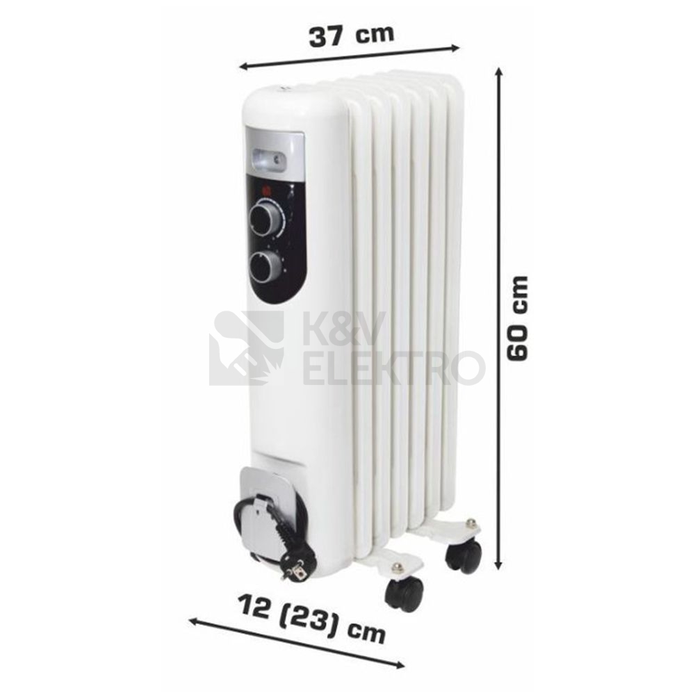 Rozměry olejového radiátoru FKOS 7M jsou 23 x 60 x 37 cm.