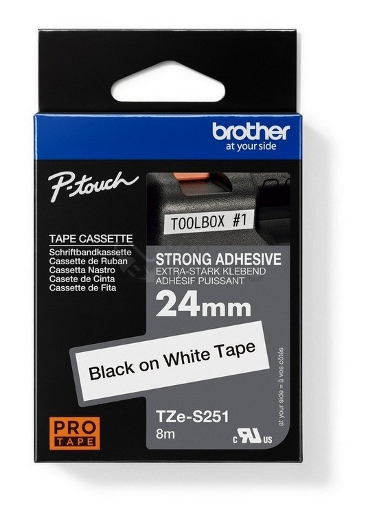 TZE-S251 - originální kazeta Brother - laminovaná páska "silně přilnavá", bílá / černý tisk, šířka 24 mm, délka 8 m z řady PRO Tape (design černo-modrého balení):