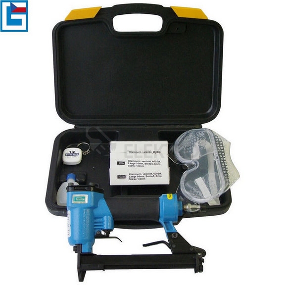 Pneumatická sponkovačka, určená pro připevňování fólií, látek, kůže, koberců, polstrování, izolačních materiálů, zadních nábytkových desek apod. nastřelováním sešívacích spon 6-14 mm. Ovládací páčka s bezpečnostní pojistkou (-> ochrana před náhodným spuštěním), jednoduché plnění zásobníku. Konstrukce: čelní odvod odpadního vzduchu, výsuvný zásobník, tepelně izolovaná rukojeť. Složení sady: spony typ 80 (-> délka: 8/10/14 mm, po 600 ks), ochranné brýle, vsuvka 1/4'', plastový transportní kufřík.