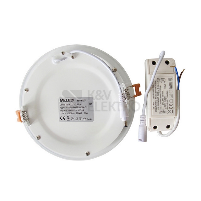 LED podhledové svítidlo 15W bílé, 230V, IP20, 3000K - teplá bílá, světelný tok 1080lm, vyzařovací úhel 120°, CRI 80, životnost 50.000h, rozměry ø172x25mm, materiál hliník/plast, nestmívatelné, PF>0,9
