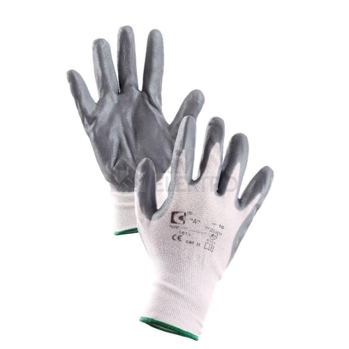 Šedé pětiprsté pracovní rukavice Abrak mají velikost 10 (XL). Tyto polyesterové úpletové rukavice povrstvené nitrilem mají protiskluzovou úpravu.