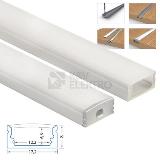 Přisazený hliníkový profil pro LED pásky, rozměry průřezu cca 17x8 mm. Součástí je mléčný difuzor, který lze do profilu nacvaknout. Tento profil je určen pro krytí a chlazení LED pásků do šíře 12 mm. Upevnění k podkladu lze provést pomocí montážních úchytů, vrutů, lepidel. K profilu lze zakoupit úchyty a koncovky.