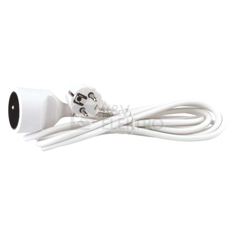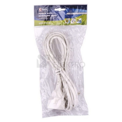 Bílý prodlužovací přívod s jednou zásuvkou - spojka, délkou 3 m a průřezem vodiče 1 mm2. Vhodný pro maximální zátěž 10 A max. Prodlužovací přívod 3 m na 230 V~ slouží k prodloužení elektrické energie tam, kam pevná zásuvka nedosáhne.
