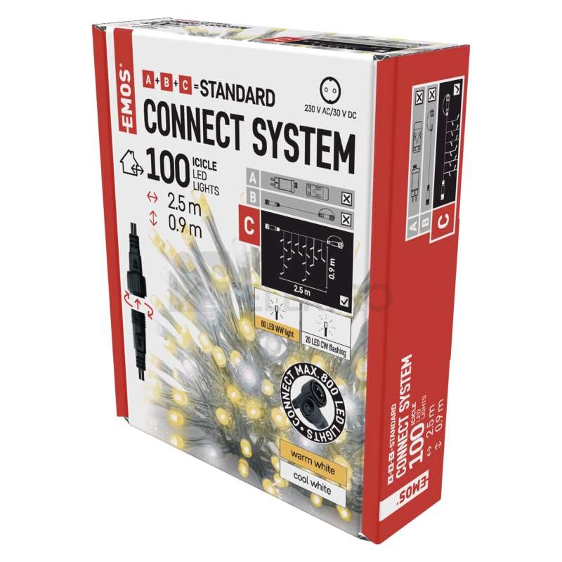 Propojovací vánoční řetěz bez zdroje EMOS Connecting D1CN01 ZY2002 100LED krápníky 2,5x0,9m studená/teplá blikající