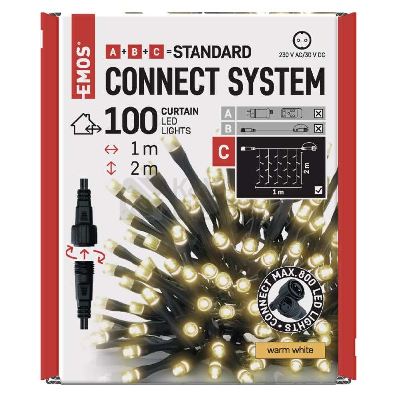 Propojovací vánoční řetěz bez zdroje EMOS Connecting D1EW01 ZY1442 100LED záclona 1x2m teplá bílá disponuje 100 diodami v teplé bílé barvě o teplotě chromatičnosti <3300 K. Jmenovité napětí 230 V. Příkon 12 W. Celková délka 1 m. Krytí IP44.