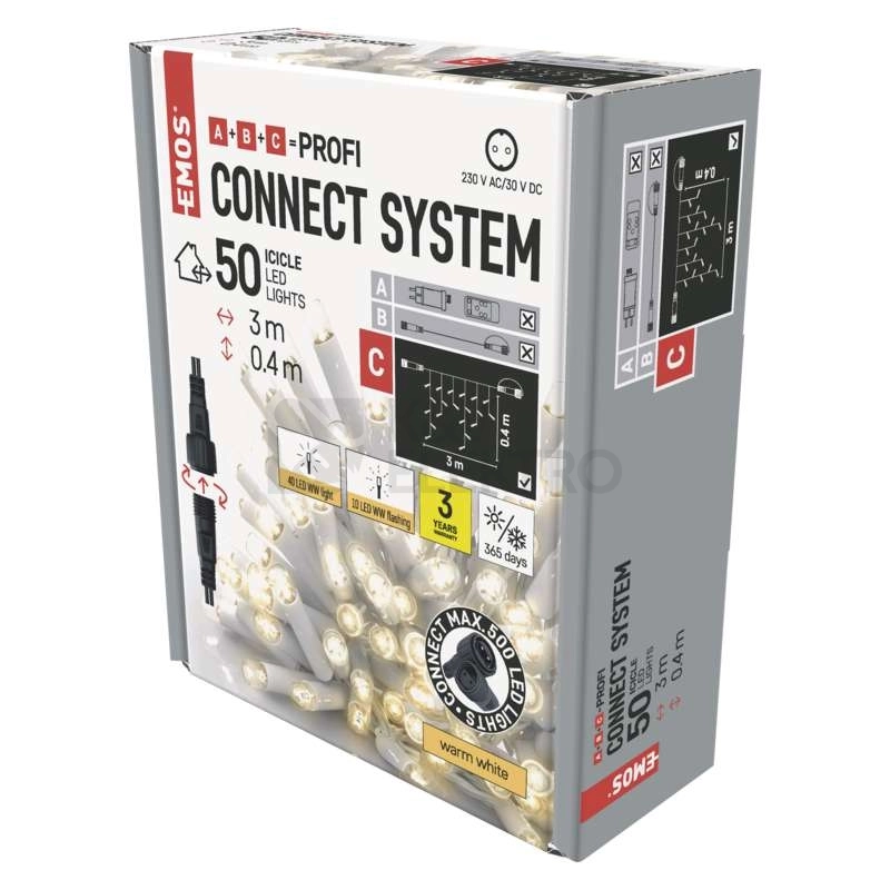 Propojovací vánoční řetěz bez zdroje EMOS Connecting D2CW04 50LED krápníky 3m teplá bílá částečně blikající