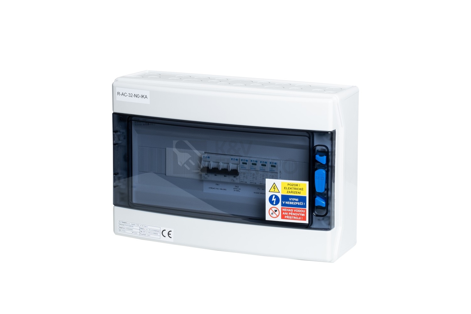 V rozváděči je osazen svodič přepětí AC T1+T2,jistič B32/3 pro jištění vstupu do střídače. Dále Jistič B2/1 který jistí PATICI/RELE Finder, které zajišťuje N0% pro splnění podmínek distribucí (součástí je jak NC, tak NO kontakt a střed.) Čímž je zajištěno použití pro všechny typy měničů na trhu.