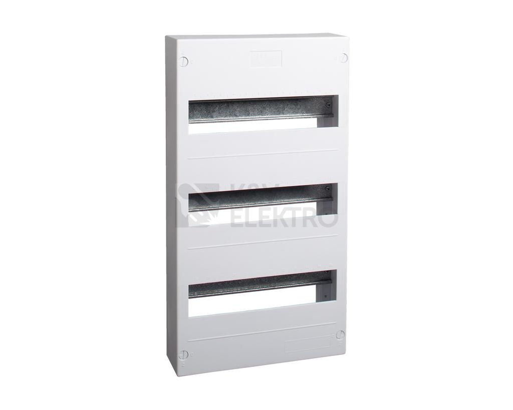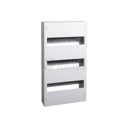 - Balení obsahuje vlastní rozvodnici, přístrojové DIN lišty, N + PE svorkovnice, čelní kryt s výřezem pro přístroje, záslepku prázdných pozic a upevňovací materiál.