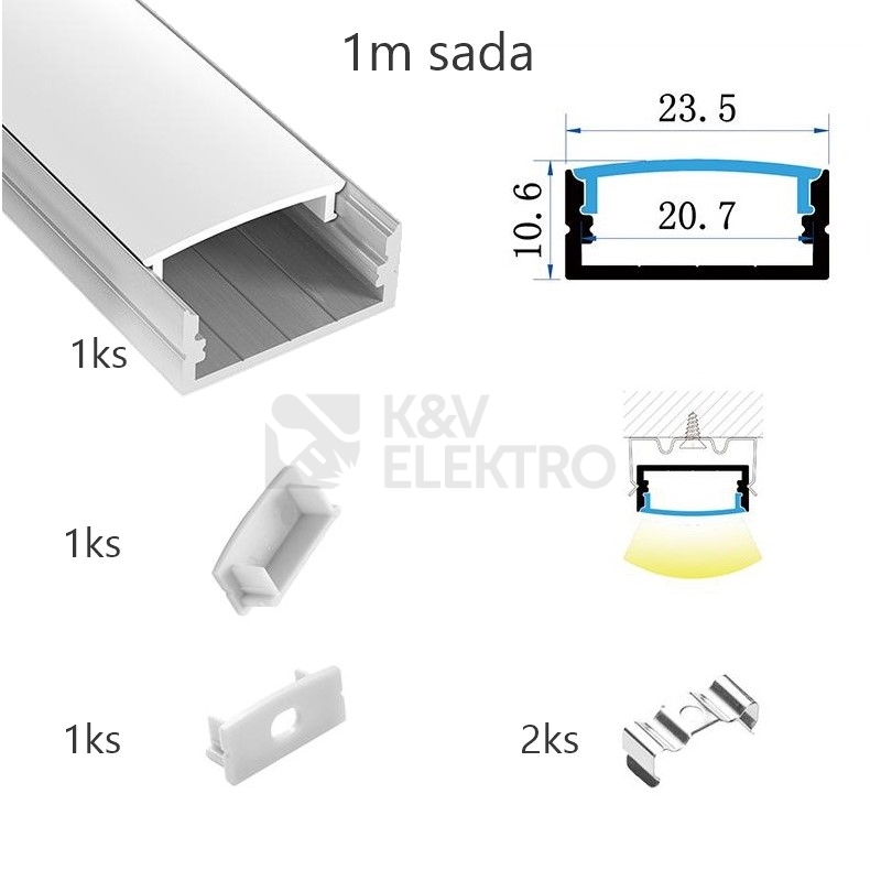 Sada lišty pro LED pásy KM27-S-MK-P 1m ve stříbrném barevném provedení určená pro přisazenou montáž o rozměrech 23,5x10,6x1000mm. Balení obsahuje: 1ks hliníkové lišty o délce 1m, 1ks matný difuzor o délce 1m, 1ks koncovky bez otvoru, 1ks koncovky s otvorem, 2ks příchytky.