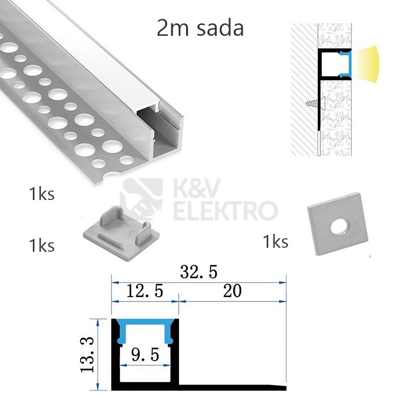 Sada lišty pro LED pásy KM65-S-MK-P 2m ve stříbrném barevném provedení o rozměrech 32x13,3x1000mm určená pro montáž k obkladům a dlažbám. Balení obsahuje: 1ks hliníkové lišty o délce 2m, 1ks matný difuzor o délce 2m, 1ks koncovky bez otvoru, 1ks koncovky s otvorem.